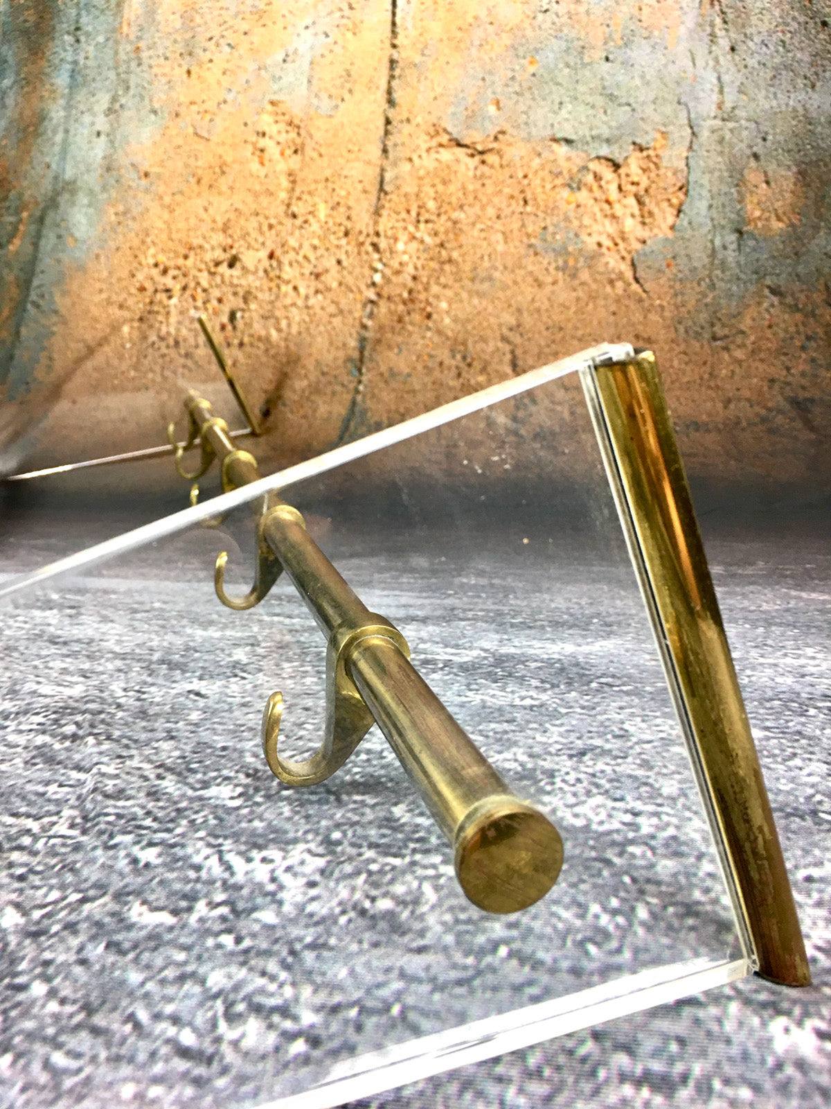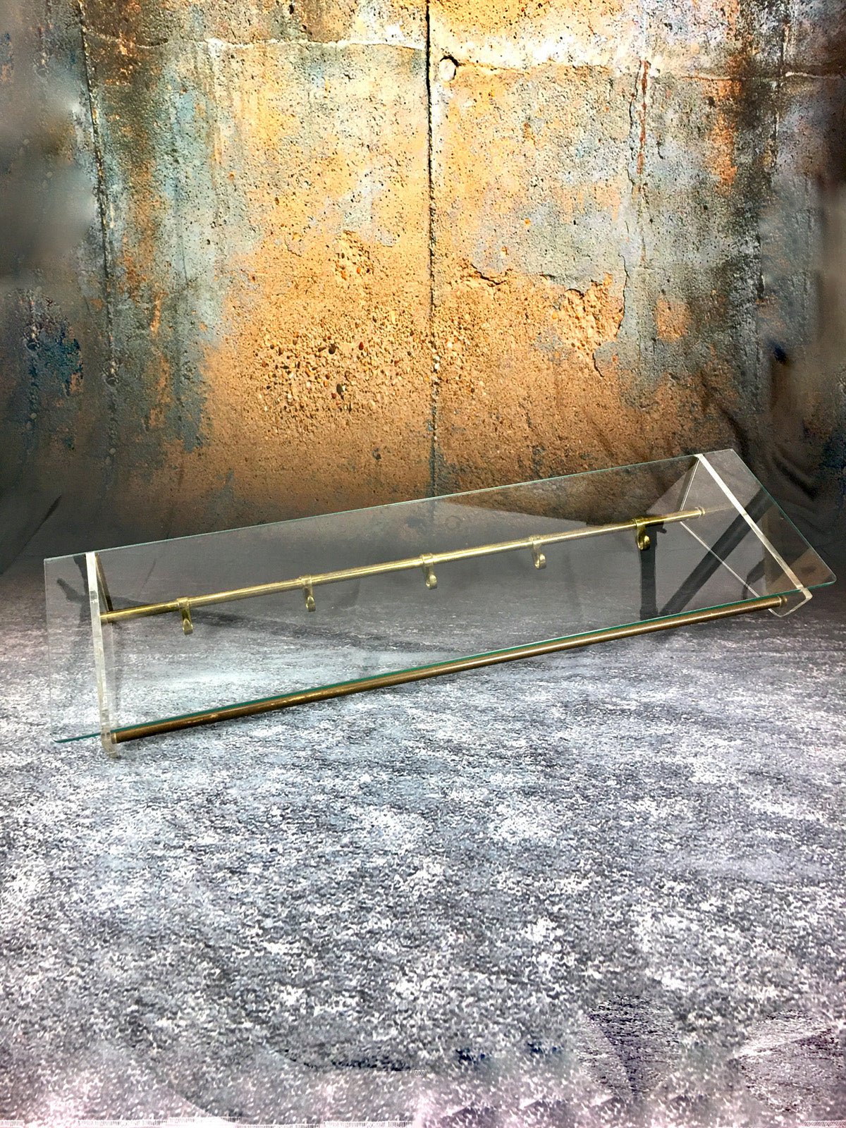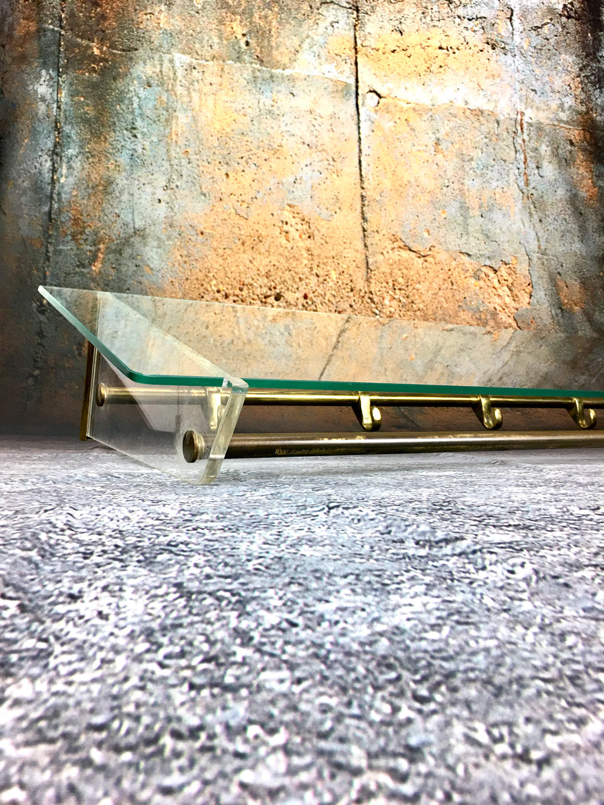 A very elegant coat rack that appears to float on the wall. It's a successful combination of 1950s elements: brass components with modern acrylic glass sides. The top surface is made of natural glass. Superbly crafted.