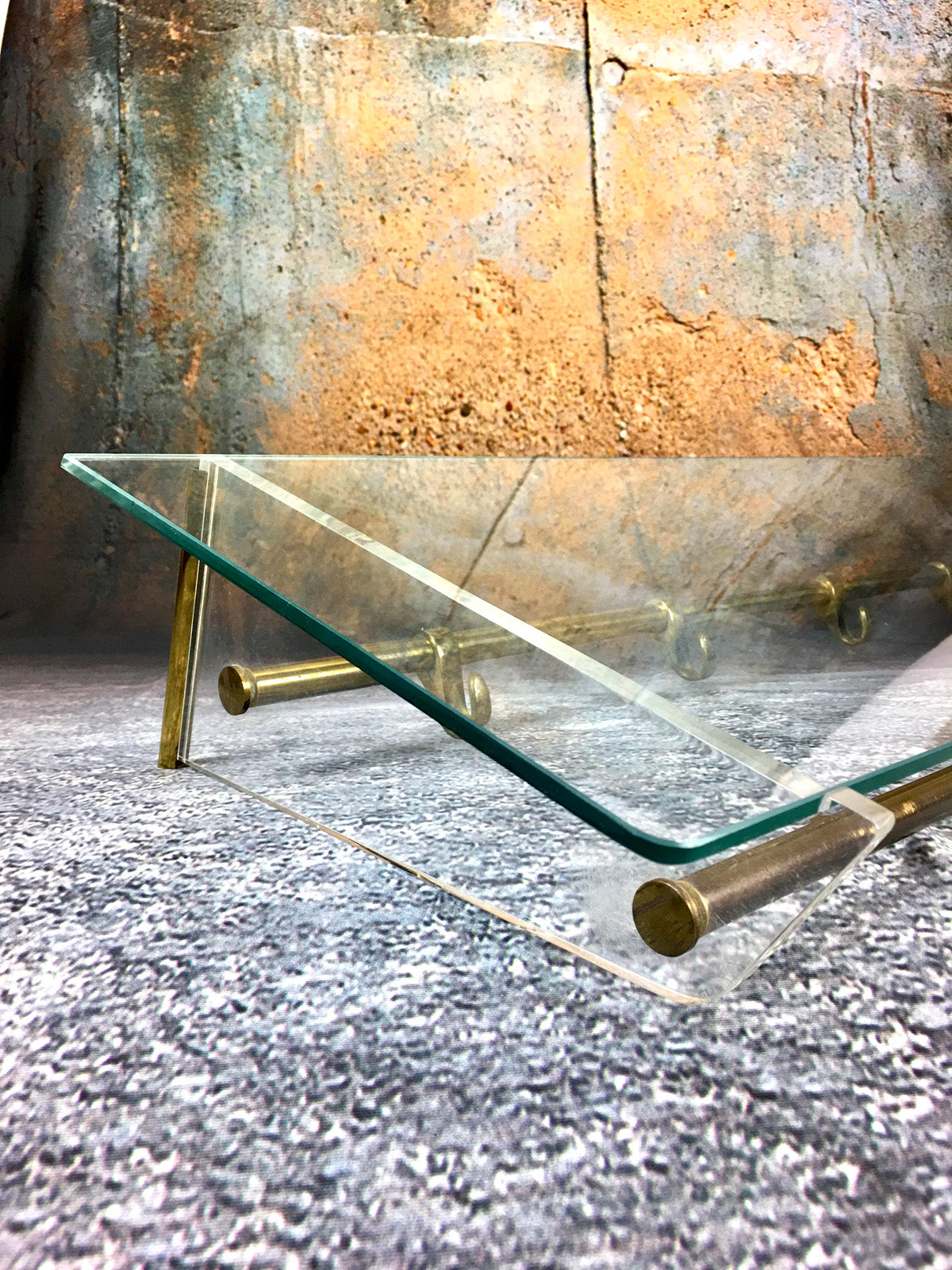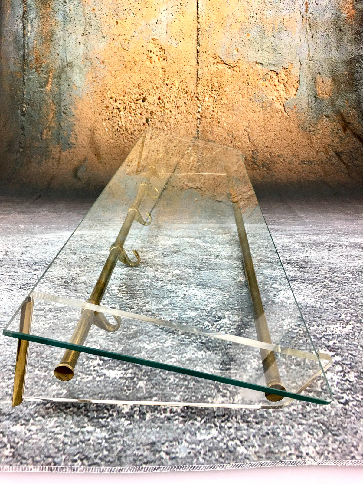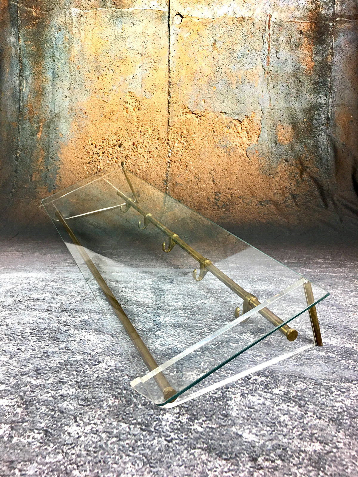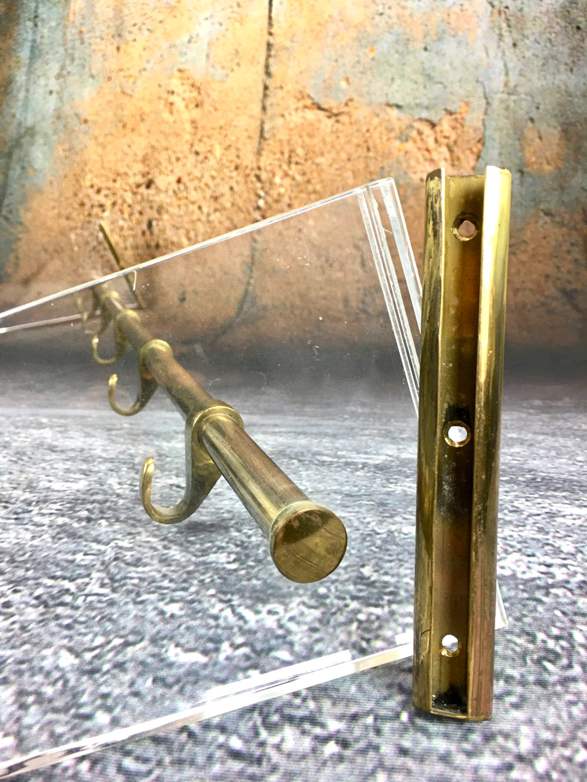 A very elegant coat rack that appears to float on the wall. It's a successful combination of 1950s elements: brass components with modern acrylic glass sides. The top surface is made of natural glass. Superbly crafted.
