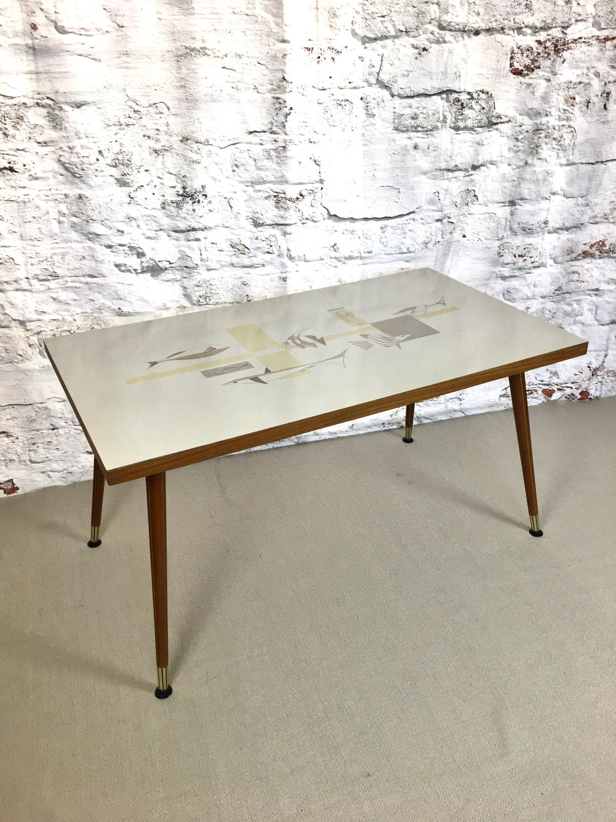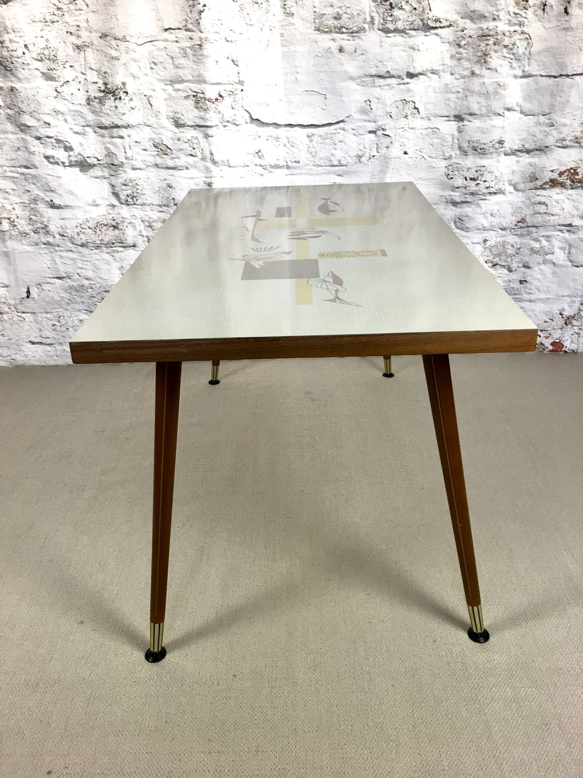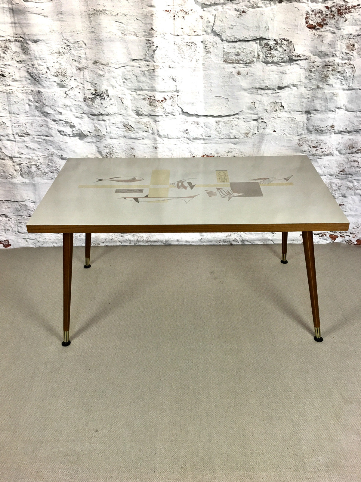 I discovered this light-footed coffee table from the 1950s near Bad Vöslau. When I picked it up, it elegantly splayed its legs and stretched out all four legs. At home, I re-glued the legs and the Formica top. The striking graphic design deserves special mention.