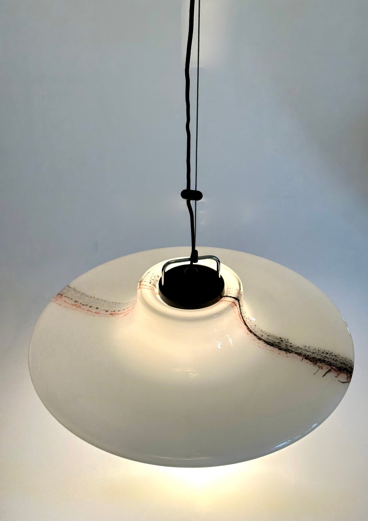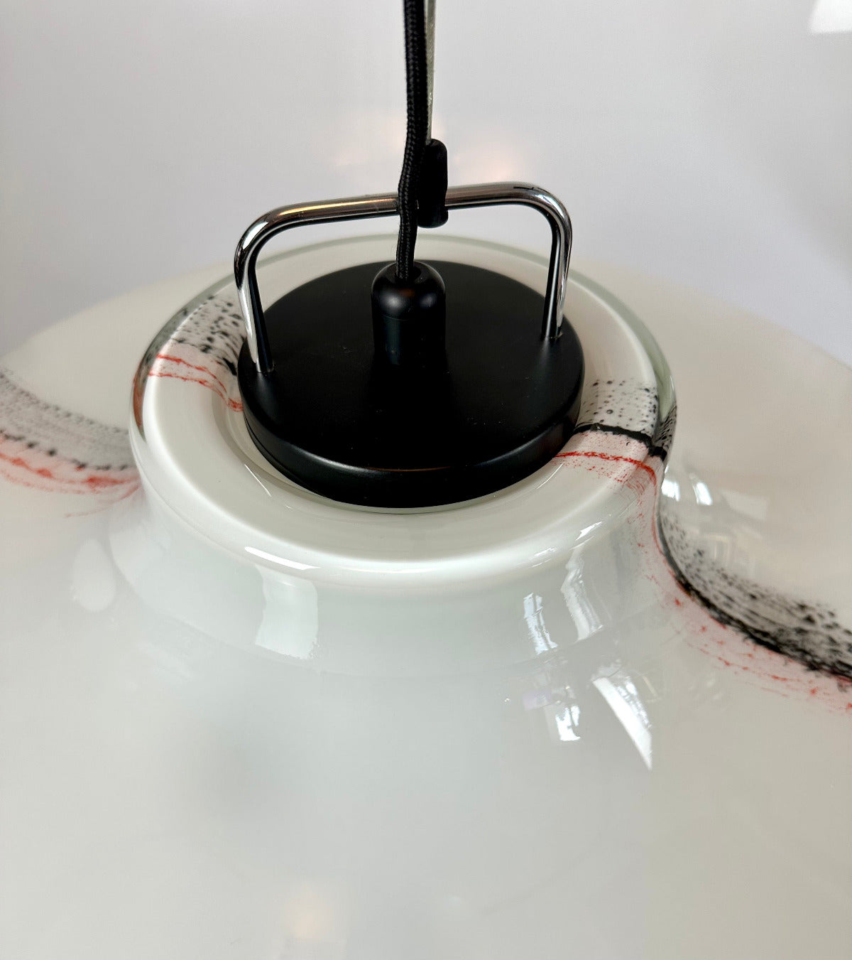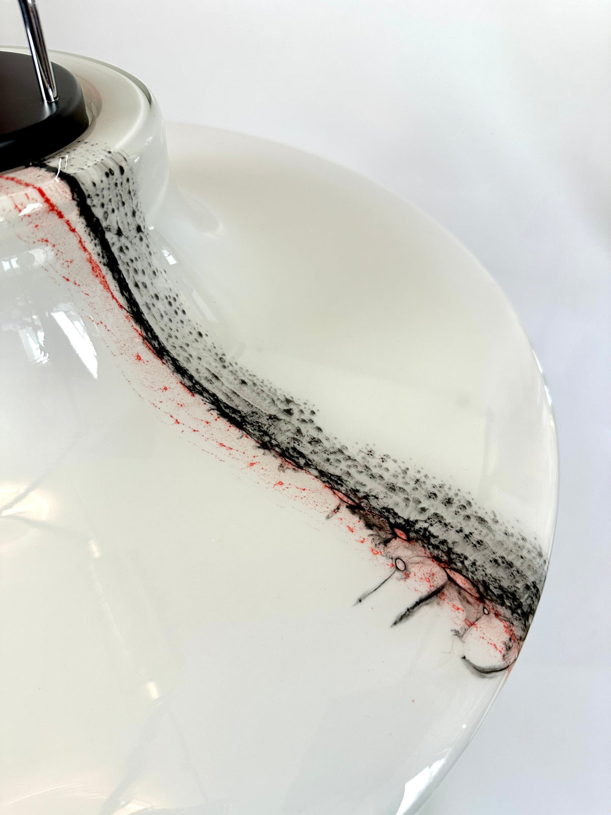 Großformatige Ausführung (Ø ca. 56 cm) aus opalisiertem Glas mit eingearbeitetem Dekor aus farbigen Glasauflagen in Schwarz und Rot. Die fein verlaufenden, wolkenartigen Linien entstehen durch aufgeschmolzene Glasfäden und sind in die Oberfläche eingebunden – jedes Exemplar mit individueller Zeichnung.