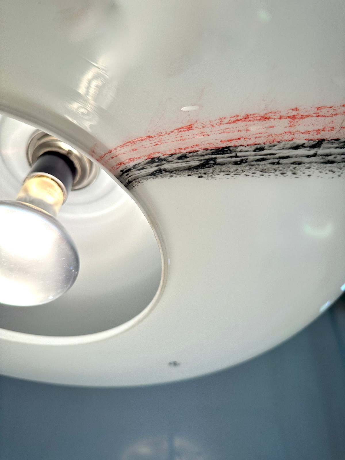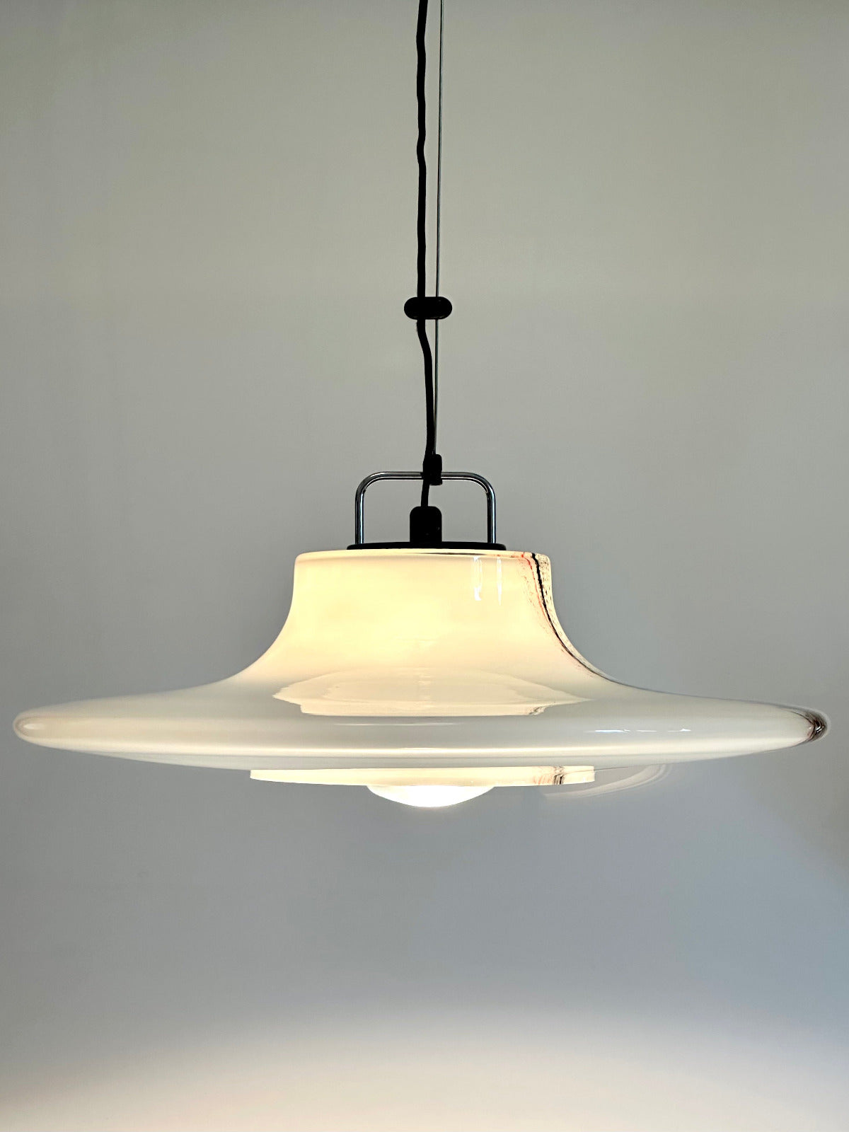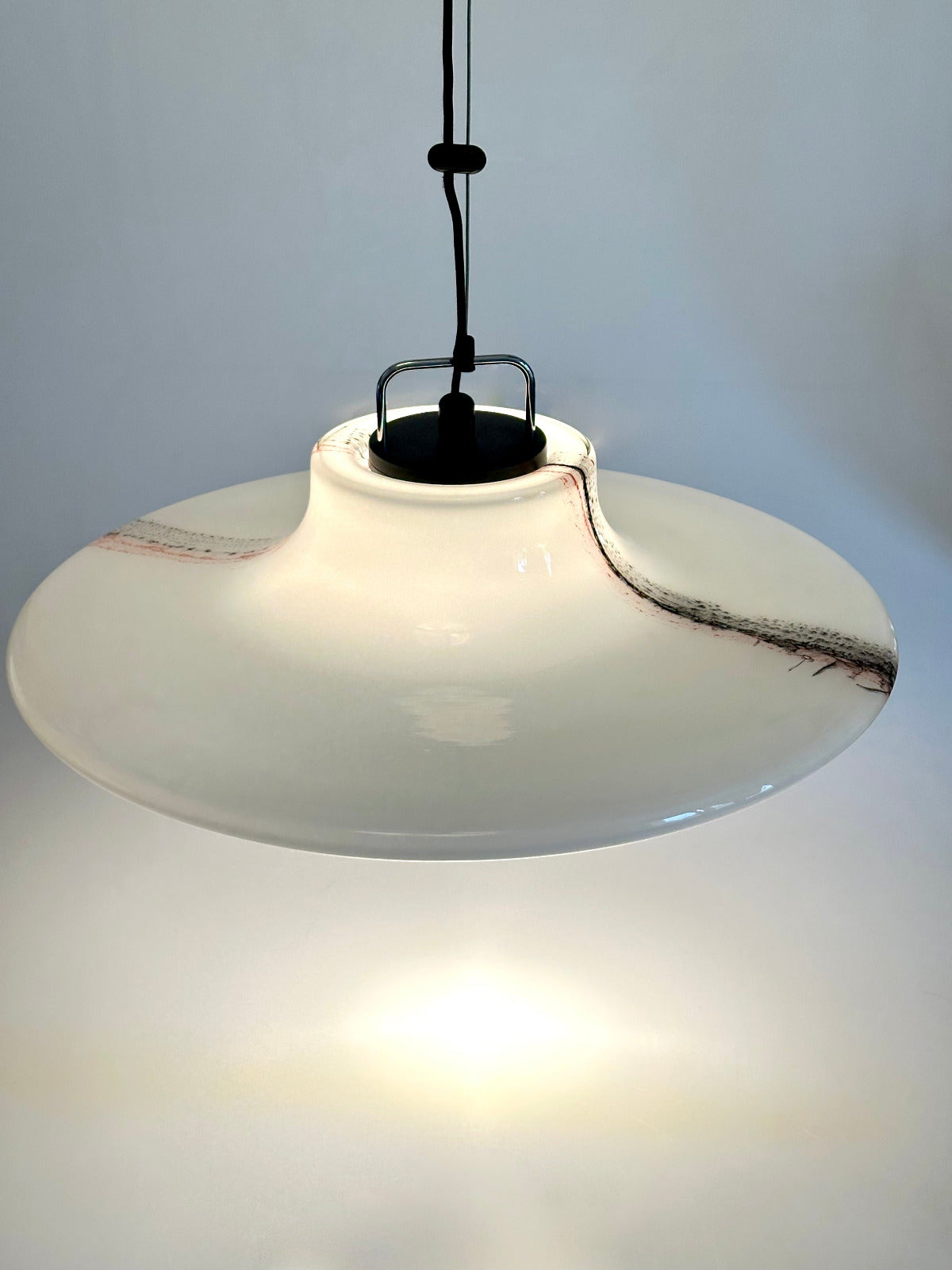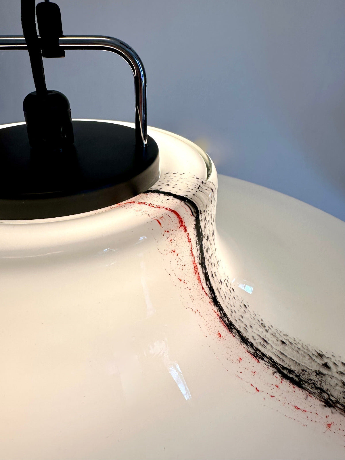 Großformatige Ausführung (Ø ca. 56 cm) aus opalisiertem Glas mit eingearbeitetem Dekor aus farbigen Glasauflagen in Schwarz und Rot. Die fein verlaufenden, wolkenartigen Linien entstehen durch aufgeschmolzene Glasfäden und sind in die Oberfläche eingebunden – jedes Exemplar mit individueller Zeichnung.