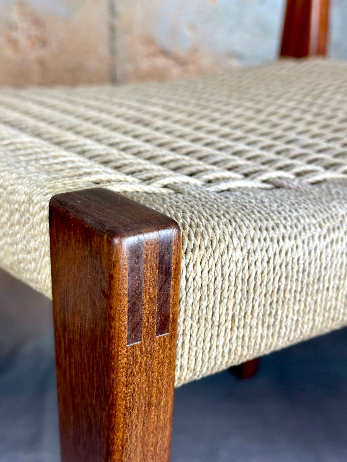 The frame, crafted from exquisite teak, impresses with its clean lines and the signature sculptural, tapered legs that bear Cadovius' mark. The ergonomic backrest ensures comfort and reflects a design philosophy that prioritizes both aesthetics and function.
